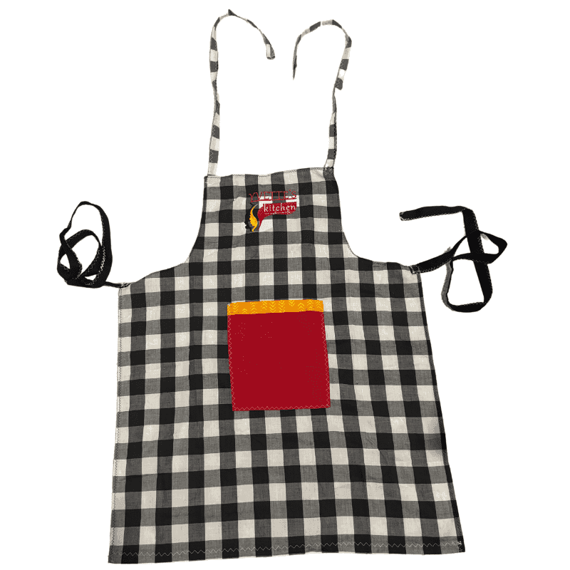 Checkered black and white apron with red pocket, yellow trim, and chef logo. A bold kitchen essential from Yvette’s Kitchen.