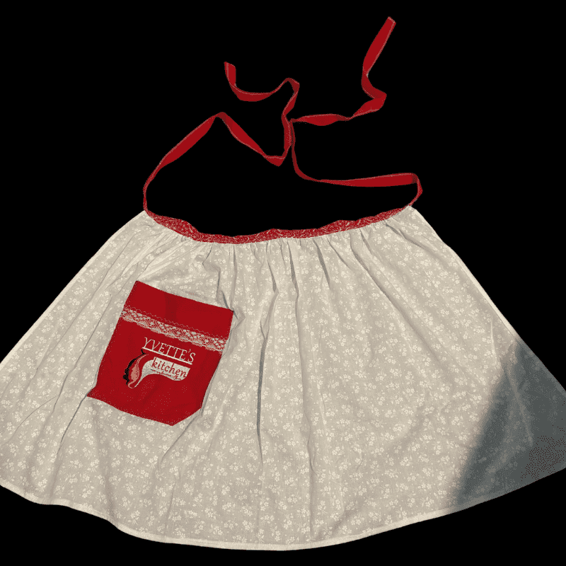 White apron with floral detail and red accents, featuring chili pepper embroidery and Yvette’s Kitchen branding.