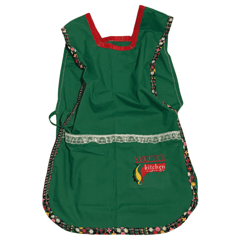 The Spice & Lace Apron is a tribute to personality, flavor, and bold kitchen style. Made with a green fabric base, this design features a vibrant red neckline and floral-patterned trim that frames the apron beautifully. A delicate lace accent runs across the midsection, adding a touch of elegance. The embroidered "YVETTE'S kitchen" and chili pepper graphic on the lower right showcase a playful nod to spice and soul.