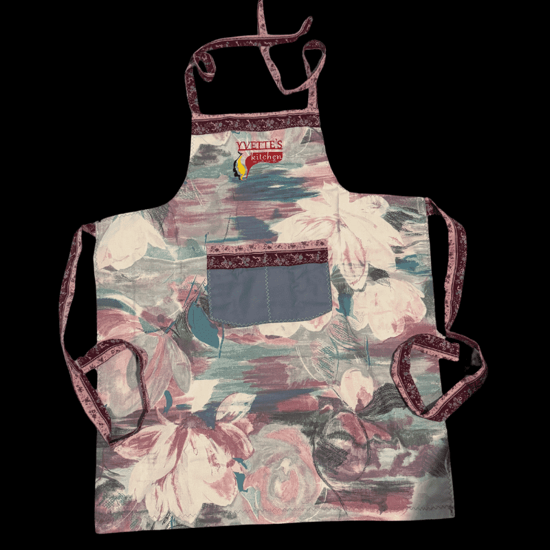 This apron celebrates expressive design and spirited cooking. The floral fabric features lush shades of pink, purple, green, and white, creating a cheerful backdrop for creative meals. A light blue center pocket adds contrast and function, highlighted with decorative trim that echoes along the neck and waist ties. At the top, the embroidered “Yvette's Kitchen” logo with a colorful parrot infuses the piece with playful elegance and island flair.